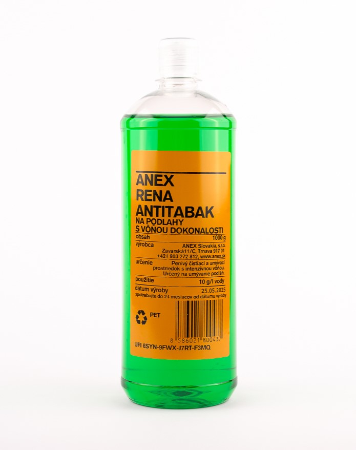 - RENA zelená antitabak – po umytí prípravkom o koncentrácii cca 1 – 5% vo vode ( 10 – 50 g/l vody ) zostáva v priestore dlhodobo príjemná vôňa