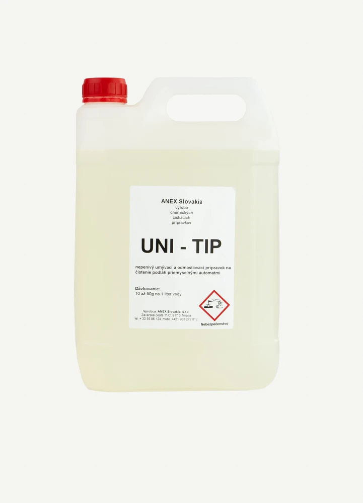 - UNI TIP – je vodou riediteľný nepenivý tekutý umývací a odmasťovací prípravok určený k čisteniu k čisteniu silne znečistených podláh vo výrobných a skladovacích halách. Využitie v strojárskom, automobilovom, sklárskom priemysle a pod.
